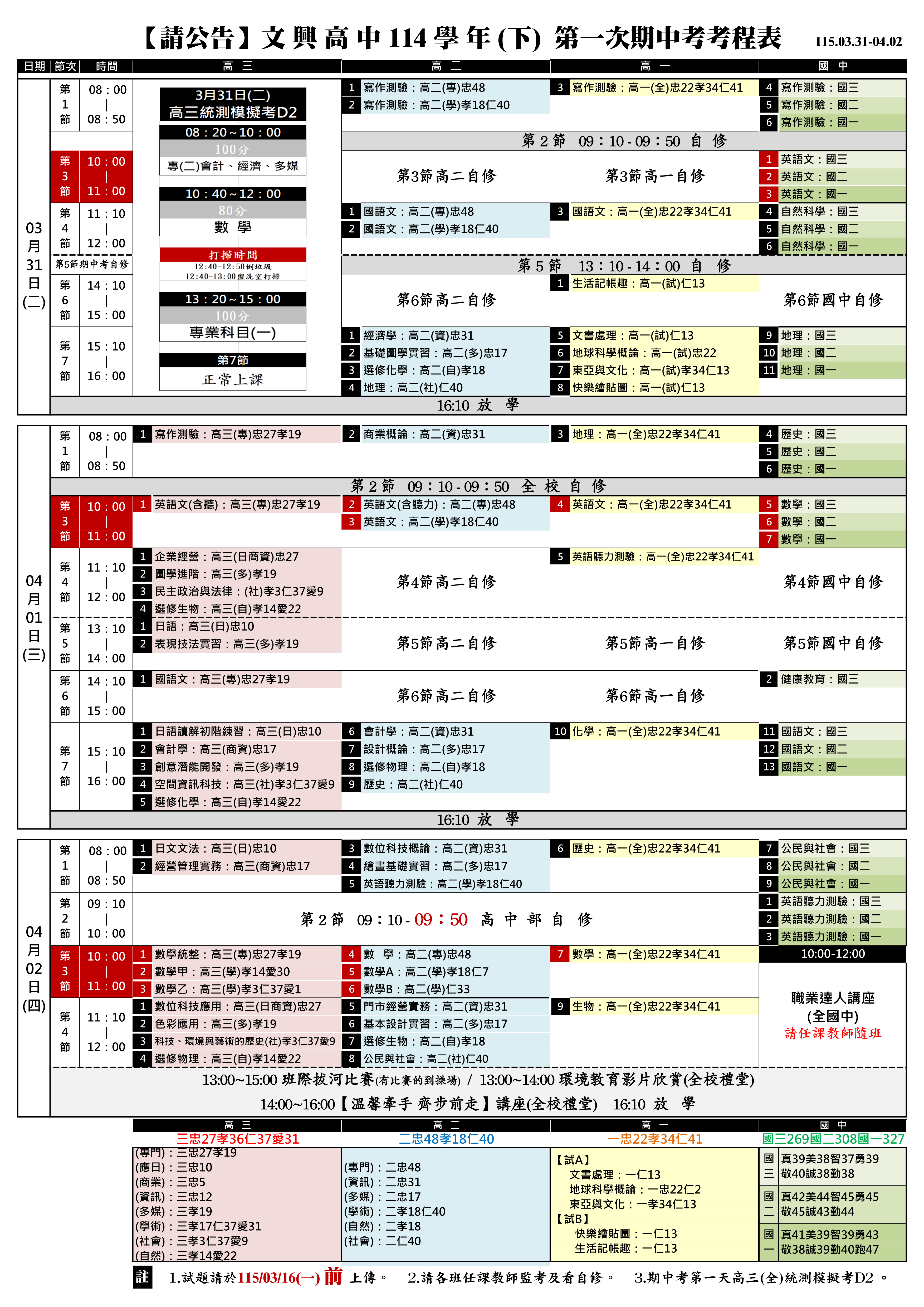 【期中考考程表】文興高中暨附設國中部114(下)第一次期中考考程表1150331-0402